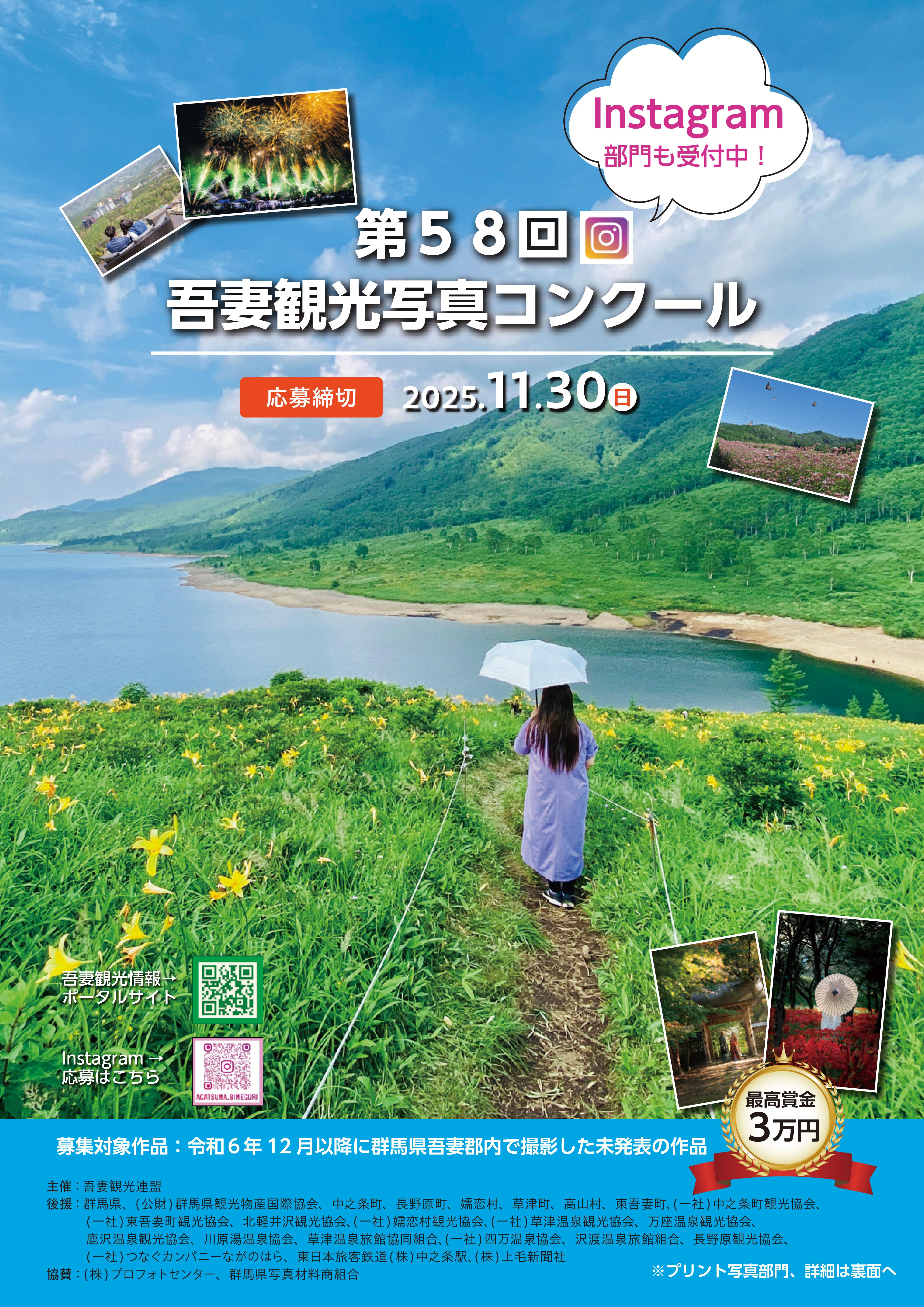 吾妻観光連盟では、吾妻郡の魅力を広く内外に発信するため、吾妻地域(中之条町、長野原町、嬬恋村、草津町、高山村、東吾妻町)の観光スポットや地域のイベントなど、見る人を吾妻に誘う写真を募集しています。