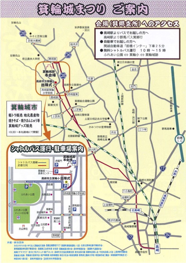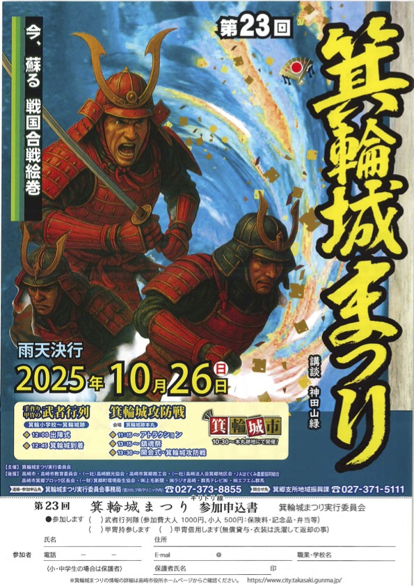 日本名城100選にその名を連ねる貴重な歴史的資源である国指定史跡「箕輪城跡」と箕輪小学校を中心に、遊び心で楽しみながら、人々との出会いの場を作る。手作り甲冑での武者行列や攻防戦などのアトラクションが開催されます。