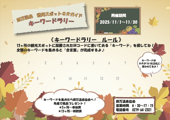 四万温泉内13ヶ所の観光スポットに設置されたQRガイドに書いてある「キーワード」を探してね!