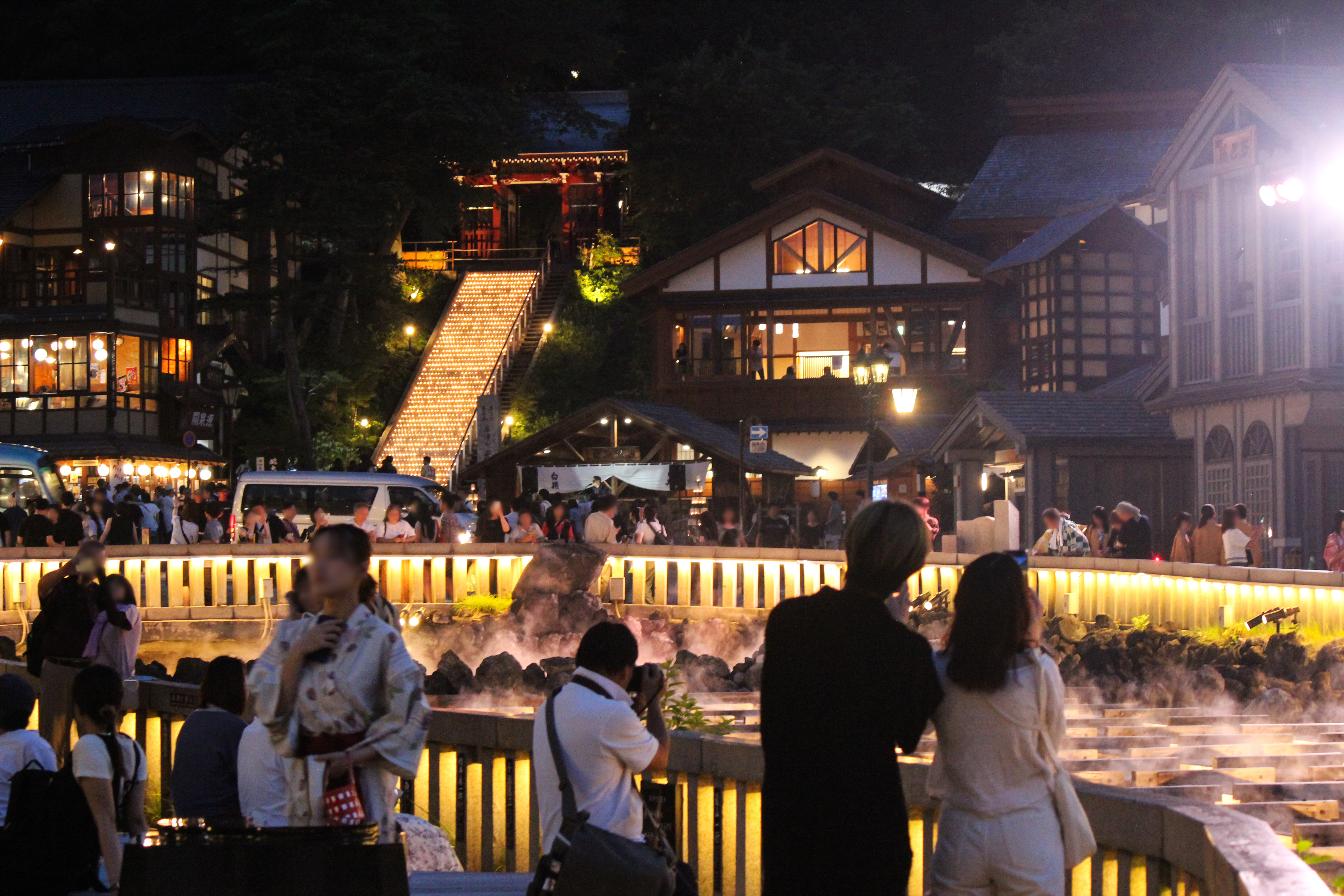 湯畑の湯けむりが織りなす、美しく幻想的な光景をお楽しみください。