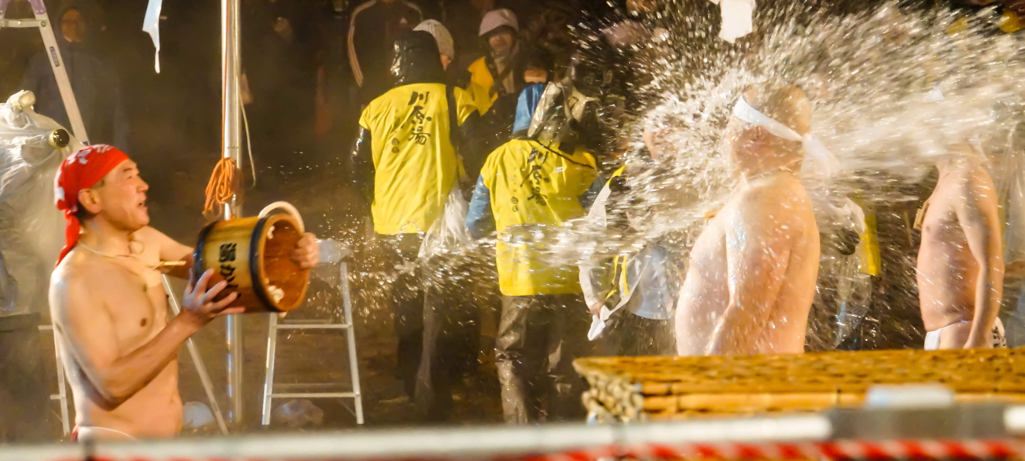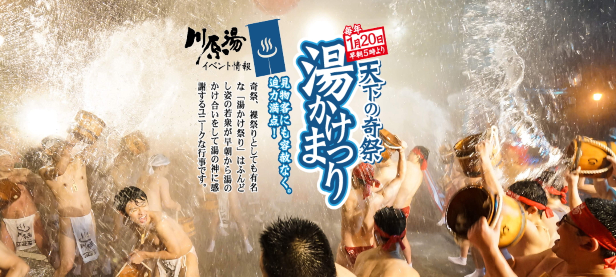 毎年1月20日の早朝5時より開催される奇祭、裸祭りとしても有名な「湯かけ祭り」は、 ふんどし姿の若衆が早朝から湯のかけ合いをして湯の神に感謝するユニークな行事です。ある日の事、突然温泉が出なくなってしまった時に村人達が困り果てていましたが、そのうちひとりが温泉の匂いをかいだところ、ニワトリの卵をゆでた匂いがしたため、ニワトリを生贄にしてお祈りしたところ、お湯が再び出てきたので、みんなでお祝いしました。「お湯わいた、お湯わいた」と喜んでいましたが、 そのうち「お祝いだ、お祝いだ」と言ってみんなでお湯をかけあうようになったのが「湯かけ祭り」のはじまりという事です。