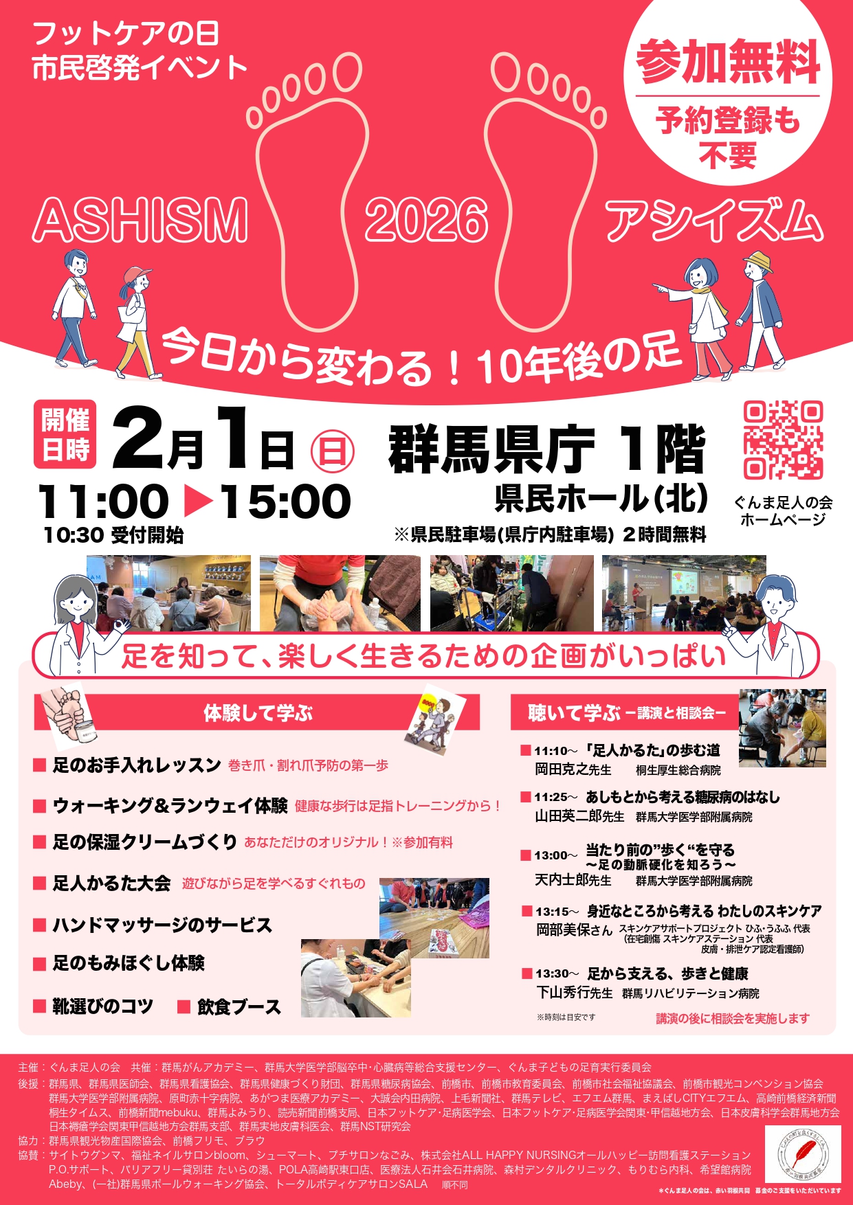 足の寿命は50年と言われていますが、あなたの足はどうですか?百年歩ける足を作りましょう。健やかな足を守るためには、まず足を意識すること。車社会の群馬県では、足への気づかいが弱いようです。大丈夫と信じていても、思わぬ足のトラブルに見舞われるかもしれません。2019年、足に取り組む医療者が声をかけあい、ぐんま足人(あしんちゅ)の会を結成しました。足に関する正しい知識、正しいケア、皆さまにお伝えしたいのです。コロナ禍を経て企画したのは、実際に市民がたくさん集まる啓発イベント、ASHISM(アシイズム)です。