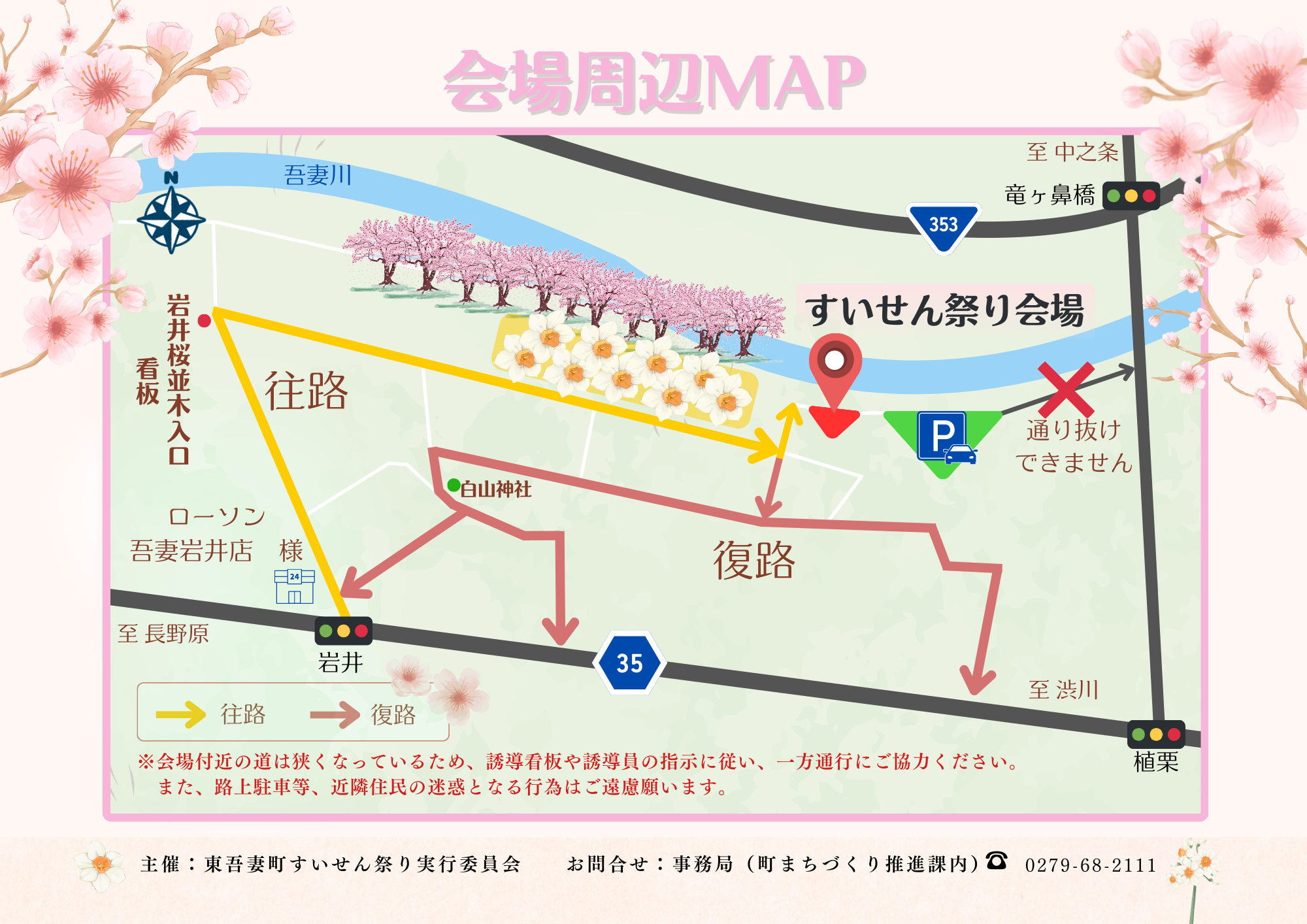 会場付近の道は狭くなっておりますので、誘導看板や誘導員の指示に従い、一方通行にご協力ください。周辺の道路は地元住民の生活道路ですので、地元車両の通行を優先させてください。