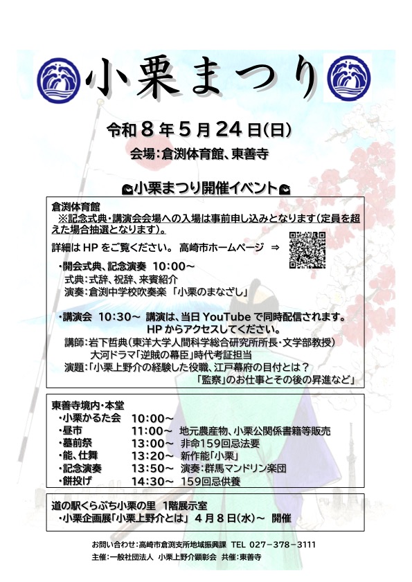 一般社団法人小栗上野介顕彰会は、令和9年NHK大河ドラマの主人公であり、高崎市ゆかりの幕臣小栗上野介忠順公の功績をより多くの方々に紹介し、史実に基づいた正しい歴史認識と理解を深めていただくことを目的に小栗まつりを開催しています。