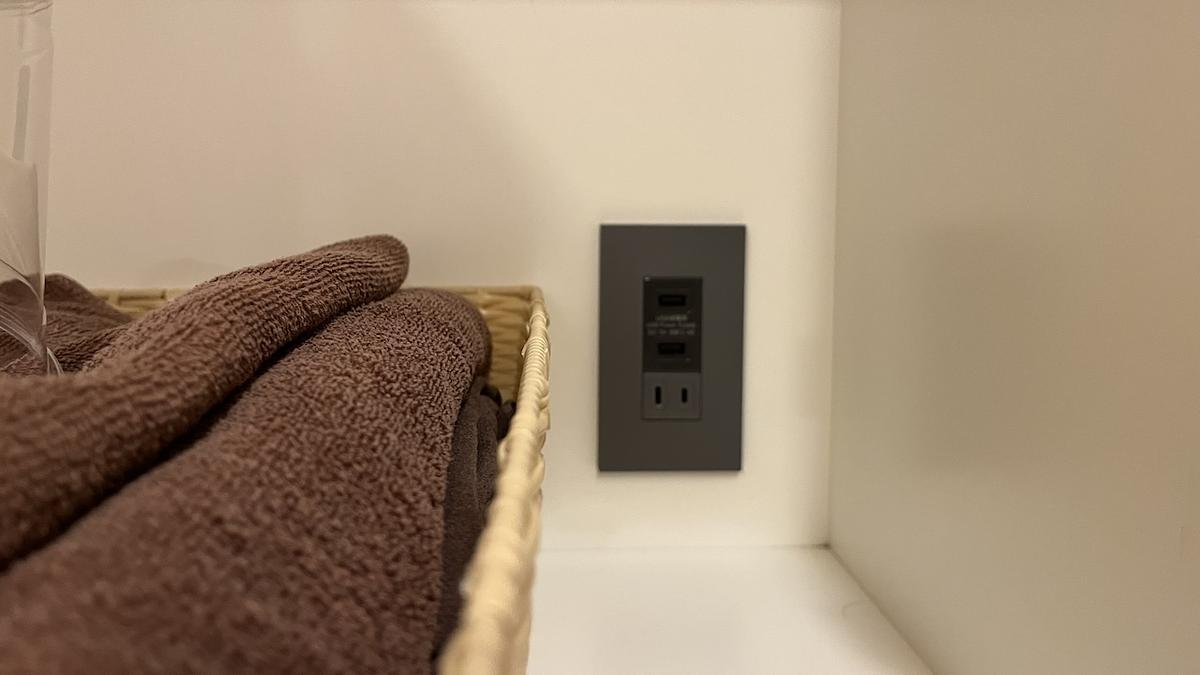 更衣室は男女で分かれていて、中には個室のシャワー室とトイレ、洗面台がありました。シャワー室には、シャンプー、コンディショナー、ボディーソープ、洗顔が備えてあります。ありがたいのは、ロッカーの中にコンセントがあったことです。スマホの充電もできちゃいます。