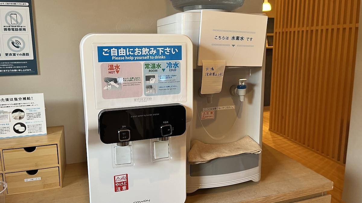 薬石浴には汗を拭く小さいタオルとコップを持っていきます。休憩室にはウォーターサーバーがありました。「水素水はお腹にいいですよ」とスタッフさんに言っていただいたので、迷わず水素水にします。
