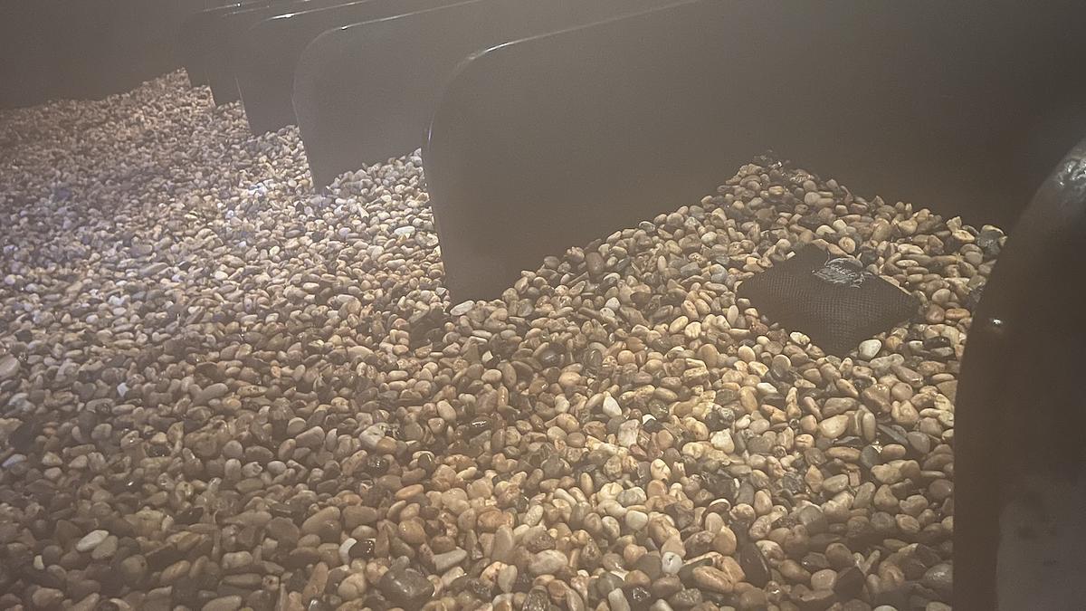 下に敷き詰められた薬鉱石の上を歩くと、「ジャリ、ジャリ」と響いて、まるで足ツボのよう。15種類の薬鉱石を使っていて、どれも角が丸みを帯びているので、痛みはそれほど感じません。