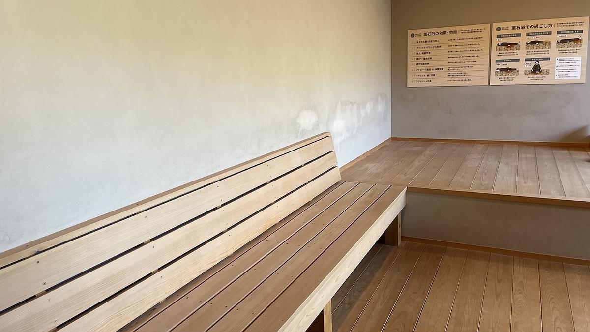 さて、薬石浴の扉は二重になっていて、少し重みがあります。ワクワクしながら中に入ると、蒸気がモワッと、体を包み込みました。