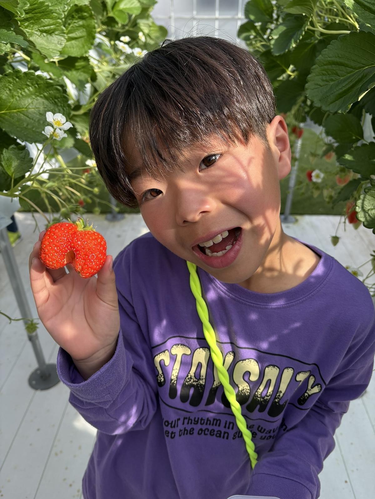 <大きないちごを見つけ、嬉しそう>
