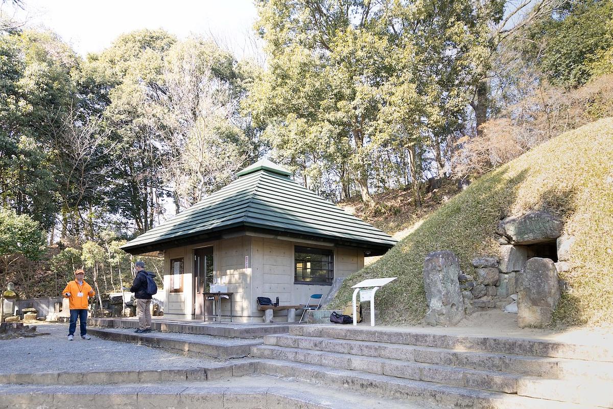 ここでもボランティアガイドさんが先客の方へ熱心に解説をされており、私もご一緒させてもらいました。石碑のすぐ隣には「山上古墳」があります 。ご厚意で懐中電灯をお借りして古墳の内部を見学してみました。光に照らされて浮かび上がったのは、驚くほど正確に積み上げられた石積みの壁面です。機械のない1,300年以上前に、これほど精緻な技術で巨石が組み上げられた事実に、思わず圧倒されました。