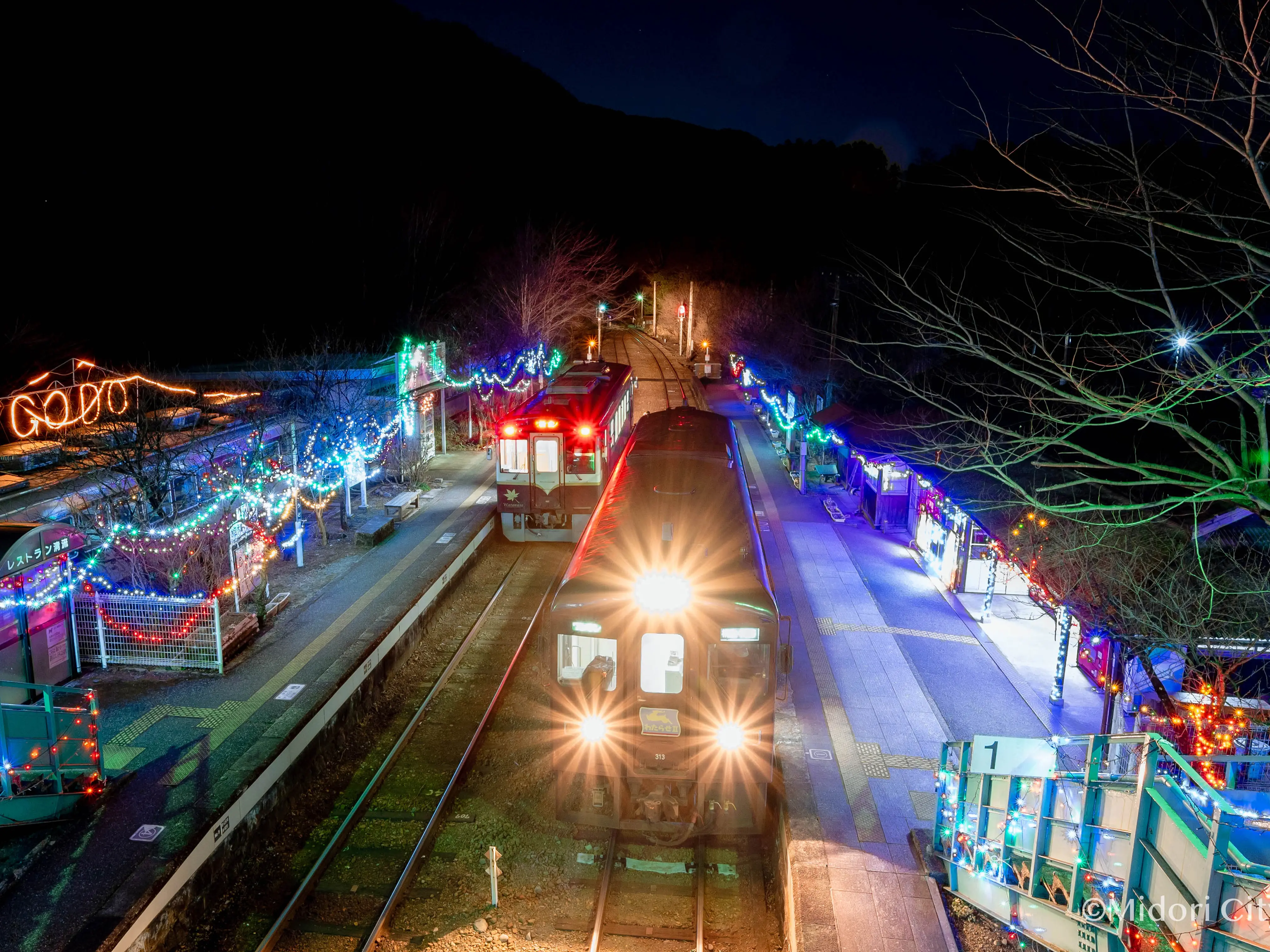 各駅のホームや駅舎が趣向を凝らしたイルミネーションで彩られます。暗闇に浮かび上がる情景は幻想的で神秘的です。冬のわたらせ渓谷鐵道にぜひお出かけください。