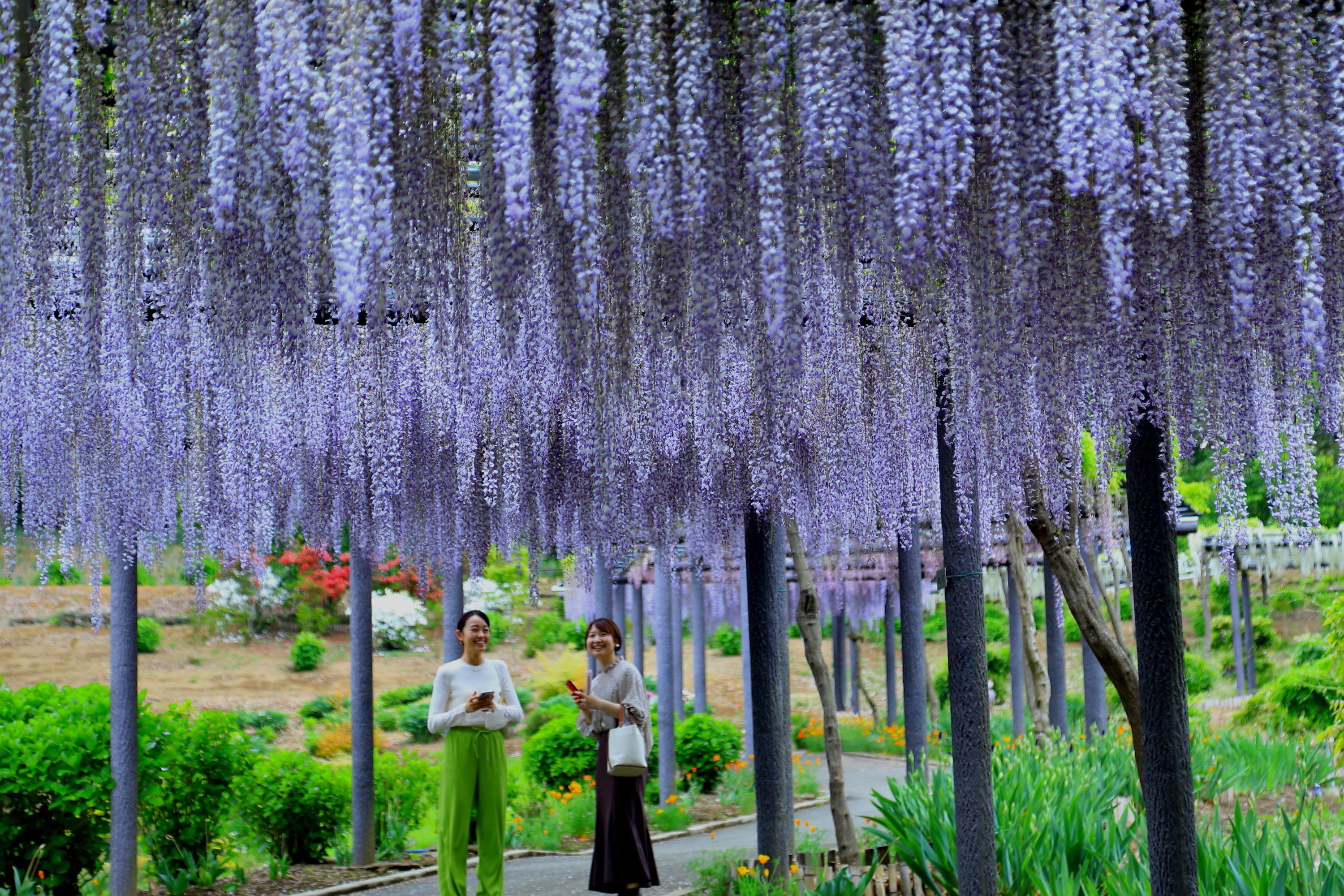 例年の藤の見頃:4月下旬~5月上旬 例年の桜の見頃:4月上旬 世界各種の45種類の藤があり、園内には約350mの藤棚があります。4月下旬~5月上旬にはふじまつりを開催します。 4月上旬にはソメイヨシノなど約60本の桜が楽しめます。また、4月下旬には、約2.3haの園内に全長約350mの藤棚、約45種の藤の見本園などがあり、夜間のライトアップも実施します。